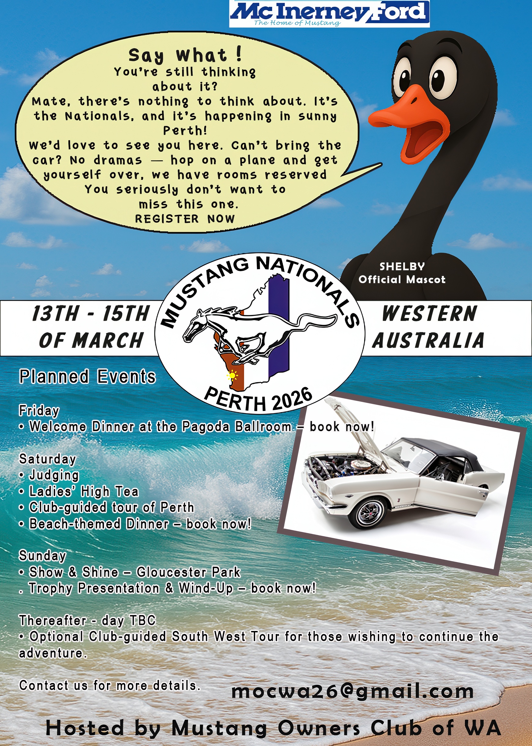 If you would like to be part of the Mustang scene and enjoy the company of other enthusiasts, join in the social events and get in touch with solving your Mustang queries, you are welcome to call the Club President on 0411 026 824 or Contact Us.